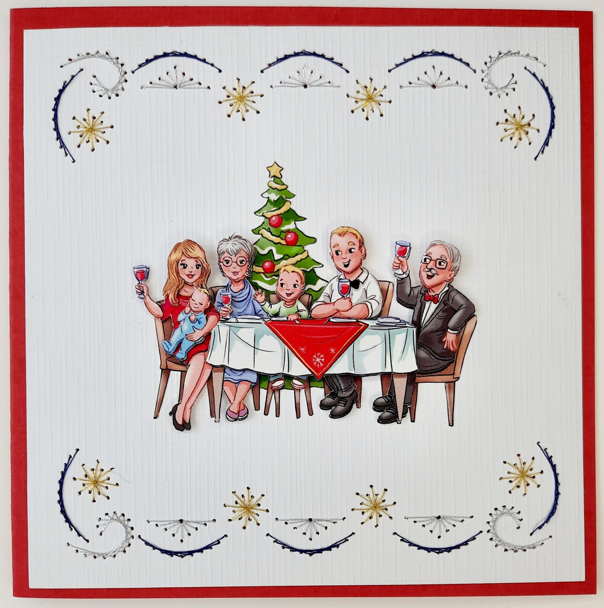 Carte 13,5 x 13,5 cm + enveloppe. Image coupée, montée en 3D et brodée à la main. Vendue sous blister.